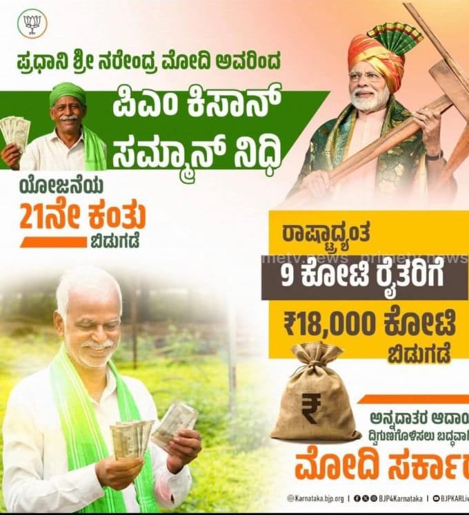 ನವದೆಹಲಿ: ಪ್ರಧಾನಮಂತ್ರಿ ನರೇಂದ್ರ ಮೋದಿ ಅವರು ಪಿಎಂ ಕಿಸಾನ್ ಸಮ್ಮಾನ್ ನಿಧಿ ಯೋಜನೆಯ 21ನೇ ಕಂತನ್ನು ದೇಶದ ರೈತರಿಗೆ ಬಿಡುಗಡೆ ಮಾಡಿದ್ದಾರೆ. ಈ ಹಂತದಲ್ಲಿ ರಾಷ್ಟ್ರದ 9 ಕೋಟಿ ರೈತರಿಗೆ ಒಟ್ಟು ₹18,000 ಕೋಟಿ ಹಣ ವರ್ಗಾವಣೆ ಮಾಡಲಾಗಿದೆ.