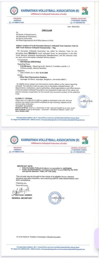 ಬೆಂಗಳೂರು: ವಾಲಿಬಾಲ್ ಫೆಡರೇಶನ್ ಆಫ್ ಇಂಡಿಯಾ ಕಳುಹಿಸಿರುವ ಸುತ್ತೋಲೆಯ ಆದೇಶದಂತೆ, ಮಾರ್ಚ್ 15ರಿಂದ 20ರವರೆಗೆ ಒಡಿಶಾದ ಭುವನೇಶ್ವರದಲ್ಲಿ ನಡೆಯಲಿರುವ 26ನೇ ಯೂತ್ ನ್ಯಾಷನಲ್ ವಾಲಿಬಾಲ್ ಚಾಂಪಿಯನ್ಶಿಪ್ (ಪುರುಷ ಮತ್ತು ಮಹಿಳಾ) ಸ್ಪರ್ಧೆಗೆ ಕರ್ನಾಟಕ ರಾಜ್ಯ ಮಹಿಳಾ ಯೂತ್ ವಾಲಿಬಾಲ್ ತಂಡದ ಆಯ್ಕೆ ಪ್ರಕ್ರಿಯೆ ಫೆಬ್ರವರಿ 13, 2026ರಂದು ನಡೆಯಲಿದೆ.