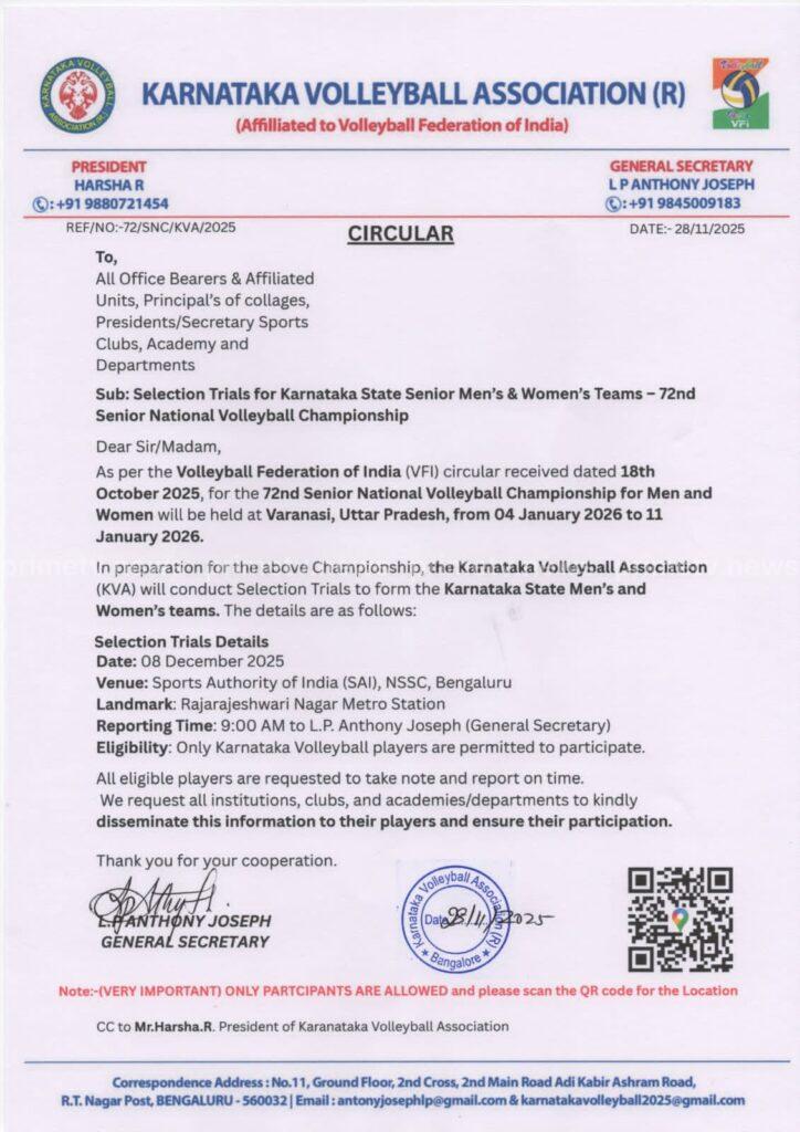 ಚಾಂಪಿಯನ್ಶಿಪ್ಗೆ ಸಿದ್ಧತೆಯಾಗಿ, ಕರ್ನಾಟಕ ವಾಲಿಬಾಲ್ ಅಸೋಸಿಯೇಷನ್ (ಕೆವಿಎ) ಕರ್ನಾಟಕ ರಾಜ್ಯ ಪುರುಷ ಮತ್ತು ಮಹಿಳಾ ತಂಡಗಳನ್ನು ರಚಿಸಲು ಆಯ್ಕೆ ಪ್ರಕ್ರಿಯೆ ದಿನಾಂಕ: 08 ಡಿಸೆಂಬರ್ 2025 ರಂದು ಬೆಳಗ್ಗೆ 9:00 ಗಂಟೆಗೆ ಭಾರತೀಯ ಕ್ರೀಡಾ ಪ್ರಾಧಿಕಾರ (SAI), NSSC, ಬೆಂಗಳೂರಿನಲ್ಲಿ ನಡೆಯುತ್ತದೆ.