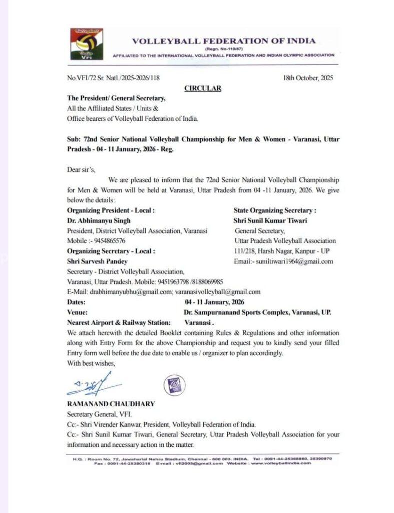 ಅಕ್ಟೋಬರ್ 18 ರಂದು ಭಾರತೀಯ ವಾಲಿಬಾಲ್ ಫೆಡರೇಶನ್ (ವಿಎಫ್ಐ) ಕಳುಹಿಸಿರುವ ಸುತ್ತೋಲೆಯ ಪ್ರಕಾರ, ಪುರುಷರು ಮತ್ತು ಮಹಿಳೆಯರ 72 ನೇ ಸೀನಿಯರ್ ರಾಷ್ಟ್ರೀಯ ವಾಲಿಬಾಲ್ ಚಾಂಪಿಯನ್ಶಿಪ್ ಉತ್ತರ ಪ್ರದೇಶದ ವಾರಣಾಸಿಯಲ್ಲಿ ಜನವರಿ 04, ರಿಂದ 11, 2026 ರವರೆಗೆ ನಡೆಯಲಿದೆ.
