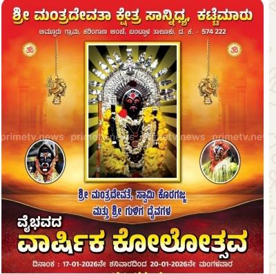 ಬಂಟ್ವಾಳ : ಬಂಟ್ವಾಳ ತಾಲೂಕಿನ ಅಮ್ಟೂರು ಗ್ರಾಮದ ಶ್ರೀ ಮಂತ್ರ ದೇವತಾ ಕ್ಷೇತ್ರ ಸಾನಿಧ್ಯ ಕಟ್ಟೆಮಾರ್ ನಲ್ಲಿ ಶ್ರೀಮಂತ್ರ ದೇವತೆ, ಸ್ವಾಮಿ ಕೊರಗಜ್ಜ, ಮತ್ತು ಶ್ರೀ ಗುಳಿಗ ದೈವಗಳ ವೈಭವದ ವಾರ್ಷಿಕ ಕೋಲೊತ್ಸವ ದಿನಾಂಕ 17 -01=2026 ಶನಿವಾರ ದಿಂದ 20-1-2026 ಮಂಗಳವಾರ ತನಕ ನಡೆಯಲಿರುವುದು.