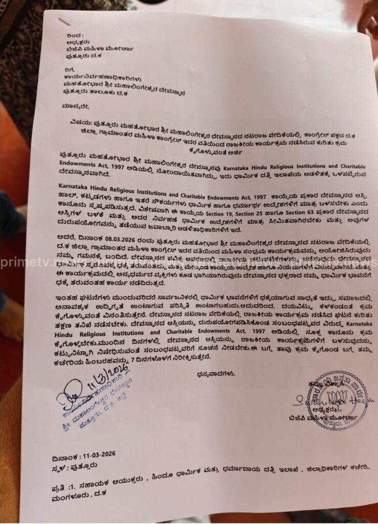 ಆದರೆ, ದಿನಾಂಕ 08.03.2026 ರಂದು ಪುತ್ತೂರು ಮಹತೋಭಾರ ಶ್ರೀ ಮಹಾಲಿಂಗೇಶ್ವರ ದೇವಸ್ಥಾನದ ನಟರಾಜ ವೇದಿಕೆಯಲ್ಲಿ ದ.ಕ ಜಿಲ್ಲಾ ಗ್ರಾಮಾಂತರ ಮಹಿಳಾ ಕಾಂಗ್ರೇಸ್ ಇದರ ವತಿಯಿಂದ ಮಹಿಳಾ ಸಂಭ್ರಮ ಕಾರ್ಯಕ್ರಮವನ್ನು ಆಯೋಜಿಸಿರುವುದು ನಮ್ಮ ಗಮನಕ್ಕೆ ಬಂದಿದೆ. ದೇವಸ್ಥಾನದ ಪವಿತ್ರ ಆವರಣದಲ್ಲಿ ರಾಜಕೀಯ ಚಟುವಟಿಕೆಗಳನ್ನು ನಡೆಸುವುದು ದೇವಸ್ಥಾನದ ಧಾರ್ಮಿಕ ಸ್ವರೂಪಕ್ಕೆ ಧಕ್ಕೆ ತರುವಂತದ್ದು ಮತ್ತು ಮೇಲ್ಕಂಡ ಕಾಯ್ದೆಯ ಉದ್ದೇಶ ಹಾಗೂ ನಿಯಮಗಳಿಗೆ ವಿರುದ್ಧವಾಗಿದೆ. ಮತ್ತು ಈ ಕಾರ್ಯಕ್ರಮದಲ್ಲಿ ಅನ್ಯಧರ್ಮದ ವ್ಯಕ್ತಿಗಳು ಕೂಡ ಭಾಗಿಯಾಗಿರುವುದು ದೇವಸ್ಥಾನದ ಭಕ್ತರಾದ ನಮ್ಮ ಧಾರ್ಮಿಕ ಭಾವನೆಗೆ ಧಕ್ಕೆ ತರುವಂತಹ ಕಾರ್ಯ ನಡೆದಿರುತ್ತದೆ.