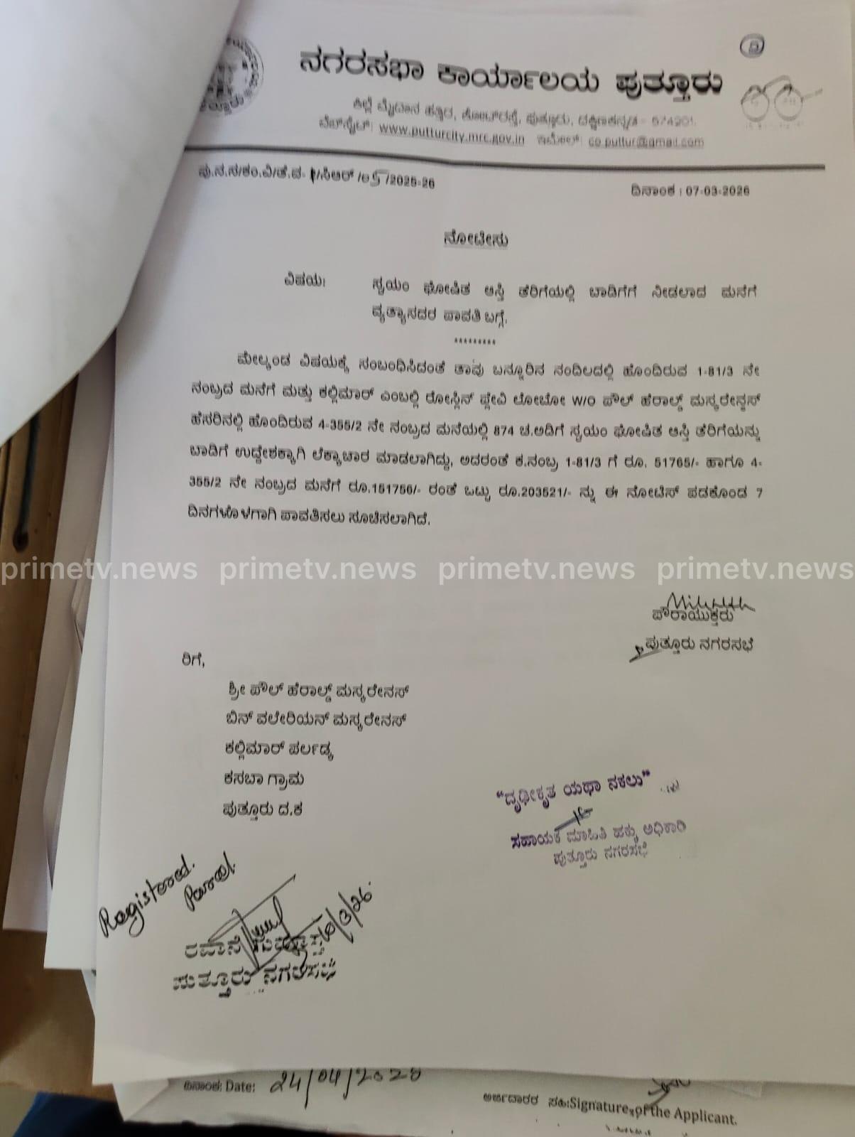 ಪುತ್ತೂರು ನಗರಸಭಾ ವ್ಯಾಪ್ತಿಯ ಬನ್ನೂರಿನ ನಂದಿಲ ಎಂಬಲ್ಲಿ ಹಾಗೂ ಪರ್ಲಡ್ಕ ಕಲ್ಲಿಮಾರು ಹೀಗೆ ಎರಡು ಕಡೆ ವಾಸ್ತವ್ಯದ ಮನೆಗಳನ್ನು ಬಾಡಿಗೆಗೆ ನೀಡಿ ಹಲವಾರು ವರ್ಷಗಳಿಂದ ನಗರಸಭೆಗೆ ತೆರಿಗೆ ವಂಚನೆ ಮಾಡಿರುವ ಕುರಿತು ಕಲ್ಲಿಮಾರು ನಿವಾಸಿ, ಮಾಯಿದೆ ದೇವುಸ್ ಚರ್ಚ್ ನ 21 ಆಯೋಗಗಳ ಸಂಯೋಜಕ ಪಾವ್ಲ್ ಹೆರಾಲ್ಡ್ ಮಸ್ಕರೇನ್ಹಸ್ ಹಾಗೂ ಅವರ ಪತ್ನಿ ರೋಸ್ಲಿನ್ ಫ್ಲೇವಿ ಲೋಬೊ ಎಂಬವರ ವಿರುದ್ಧ ಕ್ರಮ ಕೈಗೊಳ್ಳುವಂತೆ ಪುತ್ತೂರು ಸಾಮೆತ್ತಡ್ಕ ನಿವಾಸಿ ಅರುಣ್ ಪಿಂಟೊ ಎಂಬವರು ನಗರಸಭೆಗೆ ಲಿಖಿತ ದೂರು ಸಲ್ಲಿಸಿದ್ದರು. ದೂರಿನ ತನಿಖೆ ನಡೆಸಿದ ಪುತ್ತೂರು ನಗರಸಭೆ ಅಧಿಕಾರಿಗಳು ಬನ್ನೂರು ನಂದಿಲದಲ್ಲಿರುವ ಪಾವ್ಲ್ ಹೆರಾಲ್ಡ್ ಮಸ್ಕರೇನ್ಹಸ್ ಹೆಸರಿನಲ್ಲಿರುವ ಕ.ನಂಬ್ರ 1-81/3 ಗೆ ರೂ.51765/- ಹಾಗೂ ಅವರ ಪತ್ನಿ ಹೆಸರಿನಲ್ಲಿರುವ ಕಲ್ಲಿಮಾರಿನ ಕ.ನಂಬ್ರ 4-355/2 ಗೆ ರೂ.151756/- ಹೀಗೆ ಒಟ್ಟು ರೂ.2,03,521/- ನ್ನು ನೋಟೀಸ್ ಸಿಕ್ಕಿದ ಏಳು ದಿನಗಳ ಒಳಗೆ ನಗರಸಭೆಗೆ ಪಾವತಿಸಲು ಆದೇಶ ನೀಡಿರುತ್ತಾರೆ.