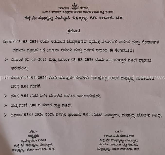 ಸುಬ್ರಹ್ಮಣ್ಯ (ದ.ಕ): ಮಾರ್ಚ್ 3ರಂದು ಸಂಭವಿಸಲಿರುವ ಚಂದ್ರಗ್ರಹಣ ಹಿನ್ನೆಲೆಯಲ್ಲಿ ಕುಕ್ಕೆ ಶ್ರೀ ಸುಬ್ರಹ್ಮಣ್ಯ ದೇವಸ್ಥಾನದಲ್ಲಿ ದರ್ಶನ ಹಾಗೂ ಸೇವೆಗಳ ಸಮಯದಲ್ಲಿ ಬದಲಾವಣೆ ಮಾಡಲಾಗಿದೆ ಎಂದು ದೇವಸ್ಥಾನ ಆಡಳಿತ ಮಂಡಳಿ ಪ್ರಕಟಣೆ ಹೊರಡಿಸಿದೆ.