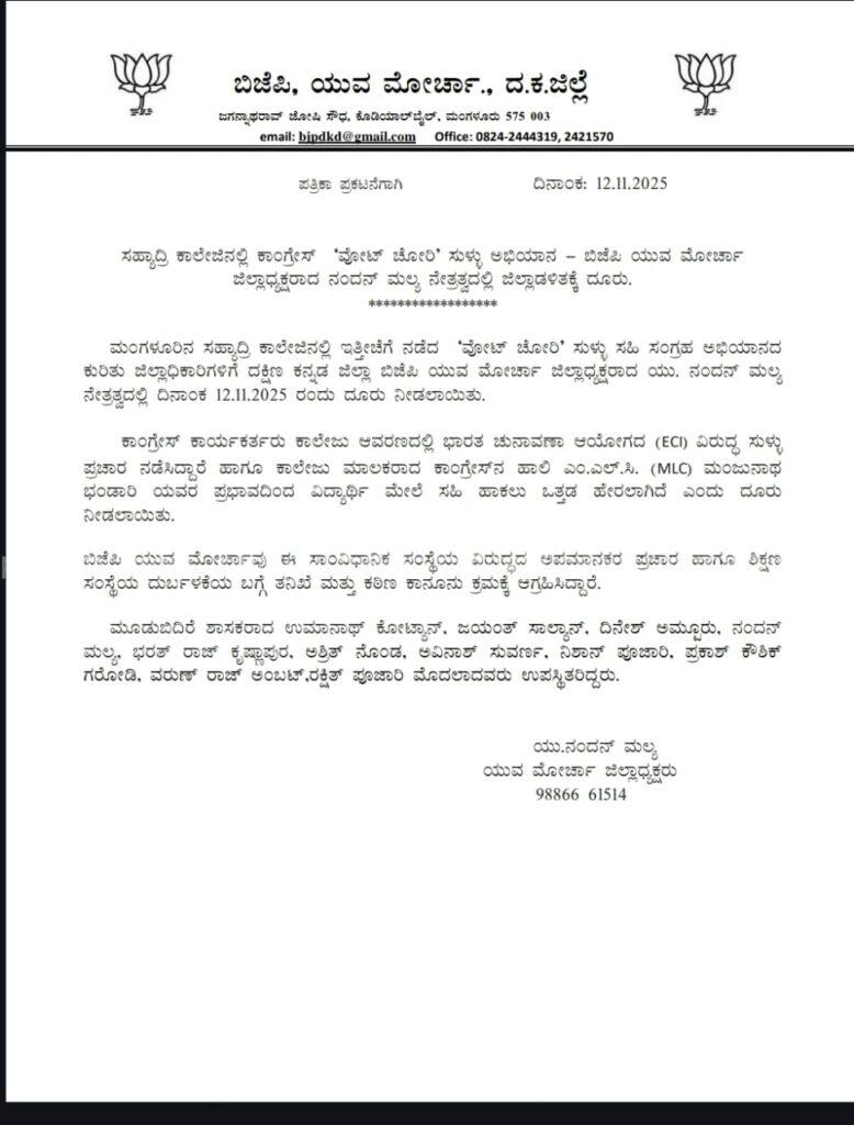 ಮಂಗಳೂರು: ನವೆಂಬರ್ 11, 2025ರಂದು ಮಂಗಳೂರಿನ ಅಡ್ಯಾರ್ ಸಹ್ಯಾದ್ರಿ ಕಾಲೇಜಿನಲ್ಲಿ ಕಾಂಗ್ರೆಸ್ ಪಕ್ಷದ ಕಾರ್ಯಕರ್ತರು ಕಾಲೇಜು ಆವರಣದೊಳಗೆ “ಮತದಾನದ ಕಳವು ಸಹಿ ಅಭಿಯಾನ” ನಡೆಸಿದ್ದಾರೆ ಎಂಬ ಆರೋಪ ಕೇಳಿಬಂದಿದೆ. ವಿದ್ಯಾರ್ಥಿಗಳಿಗೆ ತಪ್ಪು ಮಾಹಿತಿ ನೀಡಿ, ರಾಜಕೀಯ ಉದ್ದೇಶಕ್ಕಾಗಿ ಅವರನ್ನು ದಾರಿ ತಪ್ಪಿಸುವ ಪ್ರಯತ್ನ ನಡೆದಿದೆ ಎಂಬುದು ಗಮನಕ್ಕೆ ಬಂದಿದೆ.