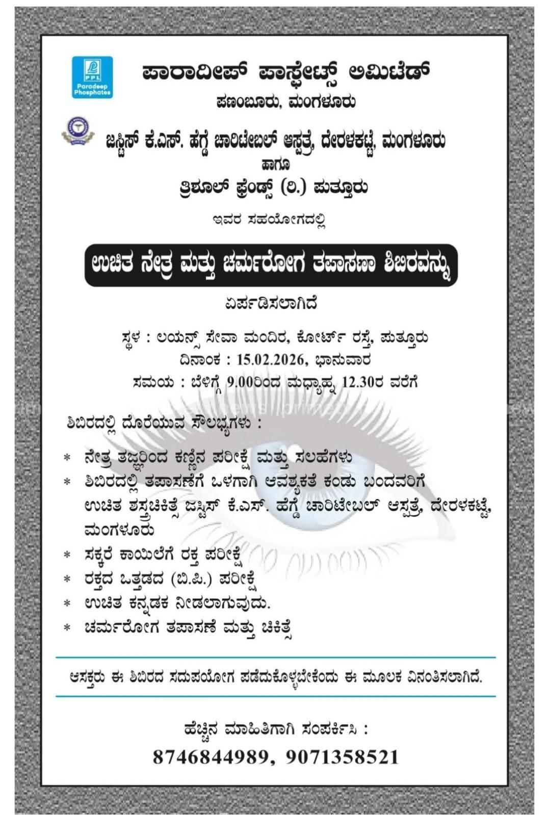 ಪುತ್ತೂರು: ಪಾರಾದೀಪ್ ಪಾಸ್ಟೇಟ್ಸ್ ಲಿಮಿಟೆಡ್ ಪಣಂಬೂರು, ಮಂಗಳೂರು ಜಸ್ಟಿಸ್ ಕೆ.ಎಸ್. ಹೆಗ್ಡೆ ಚಾರಿಟೇಬಲ್ ಆಸ್ಪತ್ರೆ, ದೇರಳಕಟ್ಟೆ, ಮಂಗಳೂರು ಹಾಗೂ ತ್ರಿಶೂಲ್ ಫ್ರೆಂಡ್ಸ್ (ರಿ.) ಪುತ್ತೂರು ಇವರ ಸಹಯೋಗದಲ್ಲಿ ಉಚಿತ ನೇತ್ರ ಮತ್ತು ಚರ್ಮರೋಗ ತಪಾಸಣಾ ಶಿಬಿರ ಫೆಬ್ರವರಿ 15ರ ಭಾನುವಾರ ಲಯನ್ಸ್ ಸೇವಾ ಮಂದಿರ ಕೋರ್ಟ್ ರಸ್ತೆಯಲ್ಲಿ ನಡೆಯಲಿದೆ.