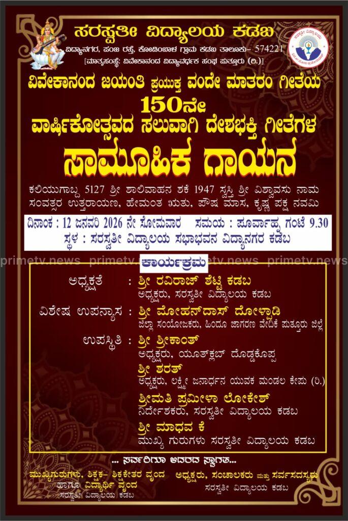 ಸೋಮವಾರ ವಿವೇಕಾನಂದ ಜಯಂತಿ ಹಾಗೂ ವಂದೇ ಮಾತರಂ ಗೀತೆಯ 150ನೇ ವರ್ಷಾಚರಣೆಯ ಅಂಗವಾಗಿ ಸಂಸ್ಥೆಯಲ್ಲಿ ಸಾಮೂಹಿಕ ದೇಶಭಕ್ತಿ ಗೀತೆಗಳ ಗಾಯನ ಕಾರ್ಯಕ್ರಮ ಜರುಗಿತು.