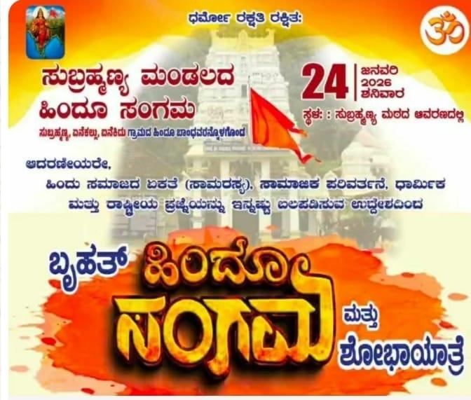 ಸುಬ್ರಹ್ಮಣ್ಯ, ಏನೇಕಲ್ಲು ಹಾಗೂ ಐನೆಕಿದು ಗ್ರಾಮಗಳ ಹಿಂದೂ ಸಂಗಮ ಸುಬ್ರಹ್ಮಣ್ಯ ಮಂಡಲದ ಸಂಯುಕ್ತ ಆಶ್ರಯದಲ್ಲಿ, ಸುಬ್ರಹ್ಮಣ್ಯ ಮಂಡಲದ ವ್ಯಾಪ್ತಿಯೊಳಗೆ ಸಮಾಜದ ಏಕತೆ, ಸಾಮರಸ್ಯ ಮತ್ತು ಸಾಮಾಜಿಕ ಪರಿವರ್ತನೆಗೆ ಒತ್ತಾಸೆಯಾಗುವ ಉದ್ದೇಶದಿಂದ ಜ.24ರಂದು “ಬೃಹತ್ ಹಿಂದೂ ಸಂಗಮ ಮತ್ತು ಶೋಭಾಯಾತ್ರೆ” ಆಯೋಜಿಸಲಾಗಿದೆ.