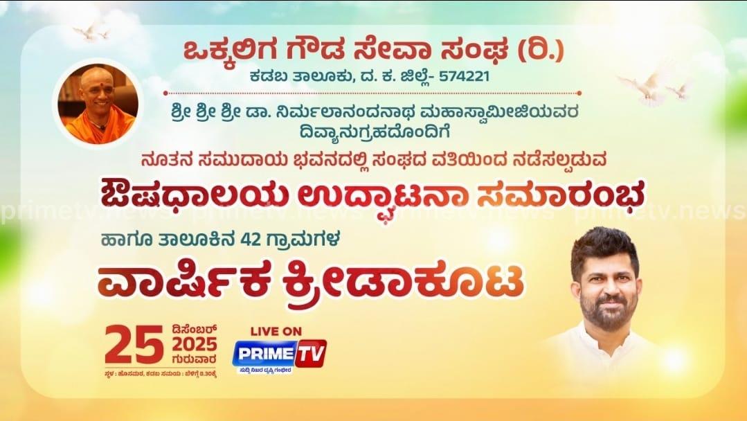 ಕಡಬ: ಒಕ್ಕಲಿಗ ಗೌಡ ಸೇವಾ ಸಂಘ (ರಿ.), ಕಡಬ ತಾಲೂಕು, ದಕ್ಷಿಣ ಕನ್ನಡ ಜಿಲ್ಲೆ (574221) ಇದರ ಆಶ್ರಯದಲ್ಲಿ ನೂತನವಾಗಿ ನಿರ್ಮಾಣಗೊಂಡ ಸಮುದಾಯ ಭವನದಲ್ಲಿ ಸಂಘದ ವತಿಯಿಂದ ಸ್ಥಾಪಿಸಲಾದ ಔಷಧಾಲಯದ ಉದ್ಘಾಟನಾ ಸಮಾರಂಭ ಹಾಗೂ ತಾಲೂಕಿನ 42 ಗ್ರಾಮಗಳ ವಾರ್ಷಿಕ ಕ್ರೀಡಾಕೂಟವು ಇಂದು (ಡಿಸೆಂಬರ್ 25, 2025 )ನಡೆಯಲಿದೆ.
