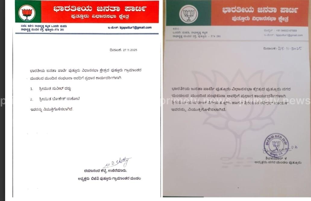 ಪುತ್ತೂರು: ಭಾರತೀಯ ಜನತಾ ಪಾರ್ಟಿ ಪುತ್ತೂರು ವಿಧಾನಸಭಾ ಕ್ಷೇತ್ರದ ಸಂಘಟನಾ ಪುನರ್‌ರಚನೆಯ ಭಾಗವಾಗಿ ನಗರ ಮತ್ತು ಗ್ರಾಮಾಂತರ ಮಂಡಳಿಗೆ ಹೊಸ ಪ್ರಧಾನ ಕಾರ್ಯದರ್ಶಿಗಳನ್ನು ನೇಮಿಸಲಾಗಿದೆ.