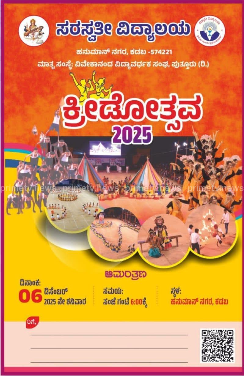 ಕಡಬ: ಸರಸ್ವತಿ ವಿದ್ಯಾಲಯ, ಹನುಮಾನ್ ನಗರ, ಕಡಬದಲ್ಲಿ ಕ್ರಿಡೋತ್ಸವ–2025 ನ್ನು ಡಿಸೆಂಬರ್ 6, ಶನಿವಾರ ಸಂಜೆ 6.00 ಗಂಟೆಗೆ ಆಯೋಜಿಸಲಾಗಿದೆ.