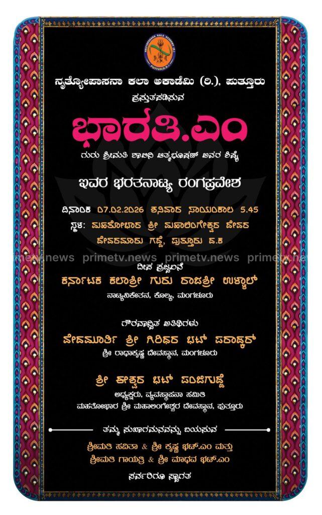 ಪುತ್ತೂರು: ಪುತ್ತೂರಿನ ನೃತ್ಯೋಪಾಸನಾ ಕಲಾ ಅಕಾಡೆಮಿ (ರಿ.) ವತಿಯಿಂದ ನೃತ್ಯಗುರು ವಿದುಷಿ ಶಾಲಿನಿ ಆತ್ಮಭೂಷಣ್‌ ಅವರ ಶಿಷ್ಯೆ ಭಾರತಿ ಎಂ. ಅವರ ಭರತನಾಟ್ಯ ರಂಗಪ್ರವೇಶ ಕಾರ್ಯಕ್ರಮ ಫೆಬ್ರವರಿ 7ರಂದು ನಡೆಯಲಿದೆ. ಪುತ್ತೂರಿನ ಮಹತೋಭಾರ ಶ್ರೀ ಮಹಾಲಿಂಗೇಶ್ವರ ದೇವಸ್ಥಾನದ ದೇವರಮಾರು ಗದ್ದೆಯ ತೆರೆದ ರಂಗಸ್ಥಳದಲ್ಲಿ ಇದೇ ಮೊದಲ ಬಾರಿಗೆ ಅರಂಗ್ರೇಟಂ ಆಯೋಜಿಸಿರುವುದು ವಿಶೇಷವಾಗಿದೆ.