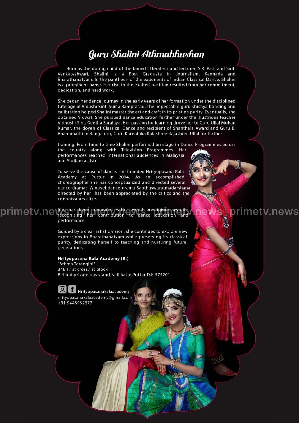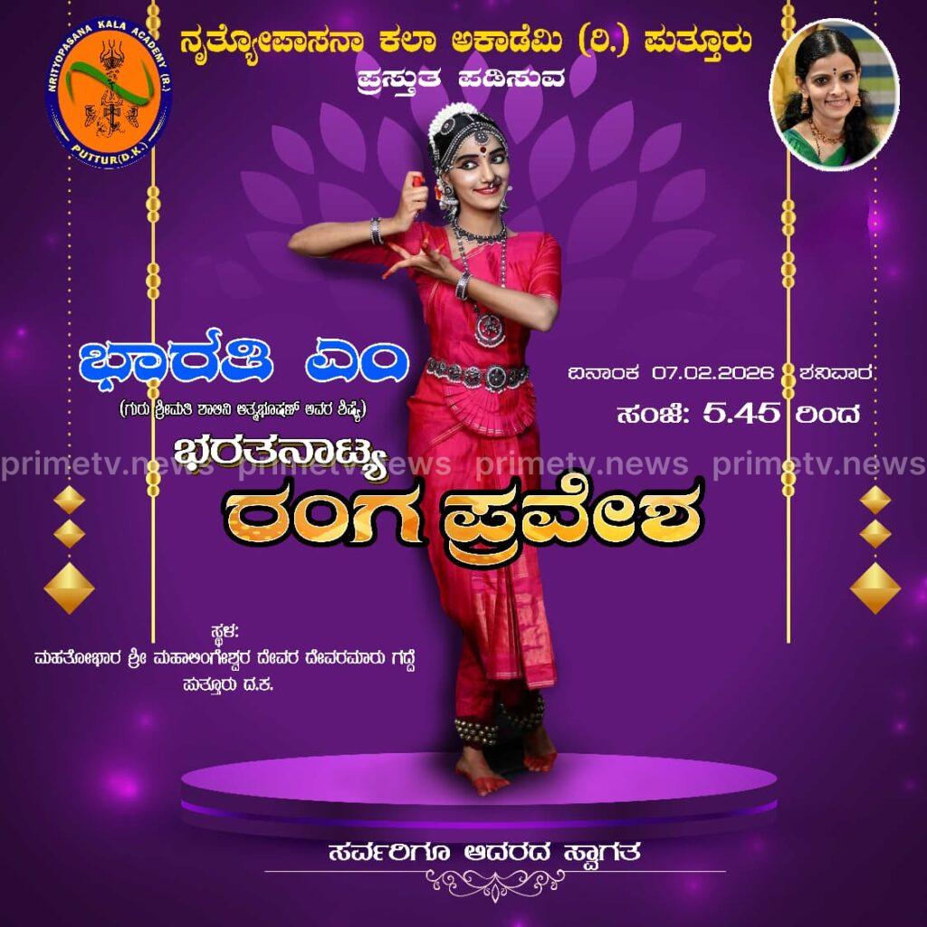 ಪುತ್ತೂರು: ಪುತ್ತೂರಿನ ನೃತ್ಯೋಪಾಸನಾ ಕಲಾ ಅಕಾಡೆಮಿ (ರಿ.) ವತಿಯಿಂದ ನೃತ್ಯಗುರು ವಿದುಷಿ ಶಾಲಿನಿ ಆತ್ಮಭೂಷಣ್‌ ಅವರ ಶಿಷ್ಯೆ ಭಾರತಿ ಎಂ. ಅವರ ಭರತನಾಟ್ಯ ರಂಗಪ್ರವೇಶ ಕಾರ್ಯಕ್ರಮ ಫೆಬ್ರವರಿ 7ರಂದು ನಡೆಯಲಿದೆ. ಪುತ್ತೂರಿನ ಮಹತೋಭಾರ ಶ್ರೀ ಮಹಾಲಿಂಗೇಶ್ವರ ದೇವಸ್ಥಾನದ ದೇವರಮಾರು ಗದ್ದೆಯ ತೆರೆದ ರಂಗಸ್ಥಳದಲ್ಲಿ ಇದೇ ಮೊದಲ ಬಾರಿಗೆ ಅರಂಗ್ರೇಟಂ ಆಯೋಜಿಸಿರುವುದು ವಿಶೇಷವಾಗಿದೆ.