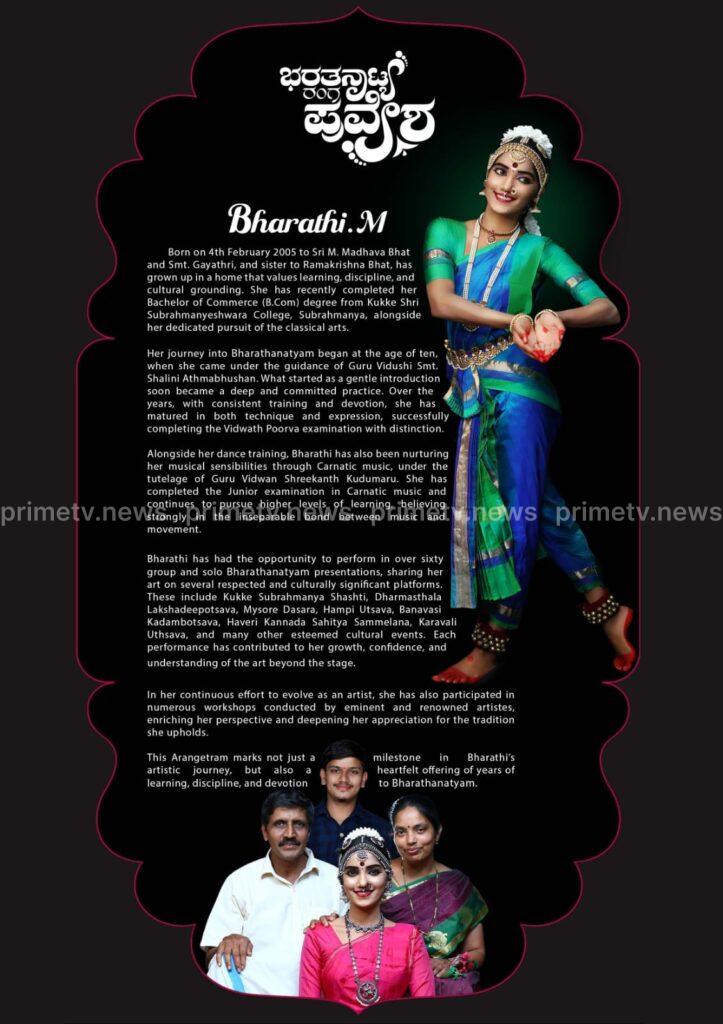 ಕಡಬ ತಾಲೂಕಿನ ಎಂ. ಮಾಧವ ಭಟ್ ಮತ್ತು ಗಾಯತ್ರಿ ದಂಪತಿಯ ಪುತ್ರಿಯಾದ ಭಾರತಿ ಎಂ. ಕಲಿಕೆ, ಶಿಸ್ತು ಹಾಗೂ ಸಾಂಸ್ಕೃತಿಕ ಮೌಲ್ಯಗಳೊಂದಿಗೆ ಬೆಳೆದಿದ್ದಾರೆ. ಸುಬ್ರಹ್ಮಣ್ಯದ ಕುಕ್ಕೆ ಶ್ರೀ ಸುಬ್ರಹ್ಮಣ್ಯೇಶ್ವರ ಕಾಲೇಜಿನಲ್ಲಿ ವಾಣಿಜ್ಯ ಪದವಿ ಪೂರ್ಣಗೊಳಿಸಿರುವ ಅವರು ಶೈಕ್ಷಣಿಕ ಅಧ್ಯಯನದ ಜೊತೆಗೆ ಶಾಸ್ತ್ರೀಯ ಕಲೆಯಲ್ಲಿ ತೊಡಗಿಸಿಕೊಂಡಿದ್ದಾರೆ. 10ನೇ ವಯಸ್ಸಿನಲ್ಲಿ ಗುರು ವಿದುಷಿ ಶಾಲಿನಿ ಆತ್ಮಭೂಷಣ್ ಅವರ ಮಾರ್ಗದರ್ಶನದಲ್ಲಿ ಭರತನಾಟ್ಯ ಕಲಿಕೆ ಆರಂಭಿಸಿದ ಭಾರತಿ ಇತ್ತೀಚೆಗೆ ವಿದ್ವತ್ ಪೂರ್ವ ಪರೀಕ್ಷೆಯಲ್ಲಿ ವಿಶೇಷ ಶ್ರೇಣಿಯಲ್ಲಿ ಉತ್ತೀರ್ಣರಾಗಿದ್ದಾರೆ.