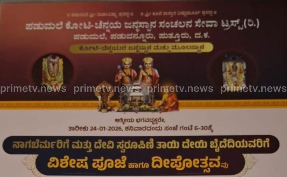 ಪಡುಮಲೆ ಕೋಟಿ ಚೆನ್ನಯ ಜನ್ಮಸ್ಥಾನ ಸಂಚಲನ ಸೇವಾ ಟ್ರಸ್ಟ್(ರಿ.) ಪಡುಮಲೆ, ಪಡುವನ್ನೂರು, ಪುತ್ತೂರು ದ.ಕ ಕೋಟಿ ಚೆನ್ನಯ ಜನ್ಮಸ್ಥಾನ ಮತ್ತು ಮೂಲಸ್ಥಾನ ಇಲ್ಲಿ ಜ.24 ರಂದು ಸಂಜೆ ಗಂಟೆ 6-30ಕ್ಕೆ ನಾಗಬೆರ್ಮರಿಗೆ ಮತ್ತು ದೇವಿ ಸ್ವರೂಪಿಣಿ ತಾಯಿ ದೇಯಿ ಬೈದೆದಿಯವರಿಗೆ ವಿಶೇಷ ಪೂಜೆ ಹಾಗೂ ದೀಪೋತ್ಸವವು ನಡೆಯಲಿರುವುದು.