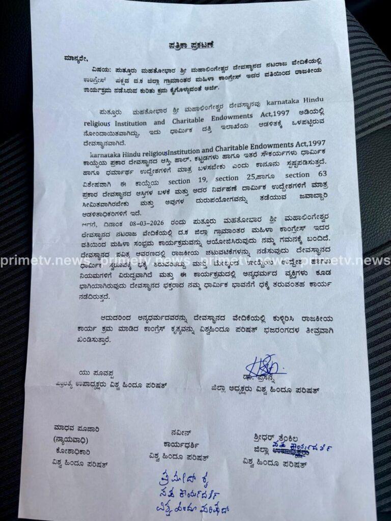 ಕಡಬ: ಪುತ್ತೂರಿನ ಐತಿಹಾಸಿಕ ಹಾಗೂ ಭಕ್ತರ ಭಾವನೆಗಳಿಗೆ ಅತ್ಯಂತ ಪವಿತ್ರವಾಗಿರುವ ಪುತ್ತೂರು ಶ್ರೀ ಮಹಾಲಿಂಗೇಶ್ವರ ಟೆಂಪಲ್ ಸಭಾಭವನದಲ್ಲಿ ರಾಜಕೀಯ ಪ್ರೇರಿತ ಕಾರ್ಯಕ್ರಮ ನಡೆದಿರುವುದನ್ನು ವಿಶ್ವ ಹಿಂದೂ ಪರಿಷದ್ (ವಿ.ಹಿಂ.ಪ) ಮಾತೃಶಕ್ತಿ ಪ್ರಮುಖ್ ಪ್ರೇಮಲತಾ ತೀವ್ರವಾಗಿ ಖಂಡಿಸಿದ್ದಾರೆ.