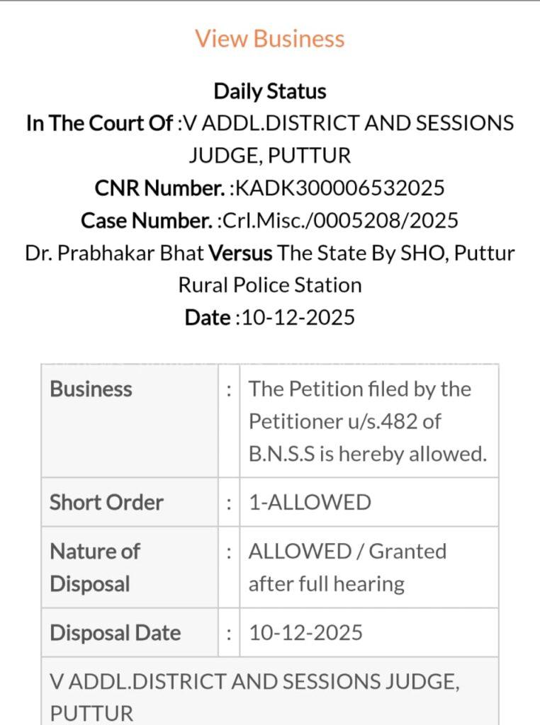 ಪ್ರಭಾಕರ ಭಟ್ ಪರವಾಗಿ ವಾದ ಮಂಡಿಸಿರುವ ಖ್ಯಾತ ವಕೀಲ ಮಹೇಶ್ ಕಜೆ ಅವರು ಜಾಮೀನು ಪ್ರಕ್ರಿಯೆ ಕುರಿತ ಮಾಹಿತಿ ಹಂಚಿಕೊಂಡರು. ದೂರು ಪುತ್ತೂರು ಗ್ರಾಮಾಂತರ ಪೊಲೀಸ್ ಠಾಣೆಯಲ್ಲಿ ದಾಖಲಾಗಿದ್ದು, ಕ್ರೈಂ ಸಂಖ್ಯೆ 118/2025 ರಂತೆ ಪ್ರಕರಣ ನೊಂದಾಯಿಸಲಾಗಿತ್ತು.