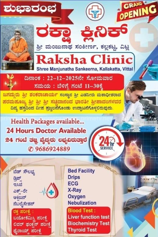 ವಿಟ್ಲ: ಸಾರ್ವಜನಿಕರಿಗೆ ಸುಸಜ್ಜಿತ ವೈದ್ಯಕೀಯ ಸೇವೆ ನೀಡುವ ನಿಟ್ಟಿನಲ್ಲಿ ವಿಟ್ಲದ ಚಂದಳಿಕೆ ಸಮೀಪದ ಕಲ್ಲಕಟ್ಟದಲ್ಲಿ ನೂತನವಾಗಿ ನಿರ್ಮಾಣಗೊಂಡಿರುವ ‘ರಕ್ಷಾ ಕ್ಲಿನಿಕ್’ ಡಿಸೆಂಬರ್ 22ರಂದು ಉದ್ಘಾಟನೆಗೊಳ್ಳಲಿದೆ. ಕಲ್ಲಕಟ್ಟದ ಶ್ರೀ ಮಂಜುನಾಥ ಸಂಕೀರ್ಣದಲ್ಲಿ ಕಾರ್ಯನಿರ್ವಹಿಸಲಿರುವ ಈ ಕ್ಲಿನಿಕ್ ಅನ್ನು ಡಿ.22ರಂದು ಬೆಳಿಗ್ಗೆ 11:30ಕ್ಕೆ ಜಗದ್ಗುರು ಶ್ರೀ ಶಂಕರಾಚಾರ್ಯ ಸಂಸ್ಥಾನ ಶ್ರೀ ಎಡನೀರು ಮಠಾಧೀಶರಾದ ಸಚ್ಚಿದಾನಂದ ಭಾರತೀ ಶ್ರೀಪಾದಂಗಳವರು ದೀಪ ಪ್ರಜ್ವಲಿಸುವ ಮೂಲಕ ಉದ್ಘಾಟಿಸಲಿದ್ದಾರೆ.