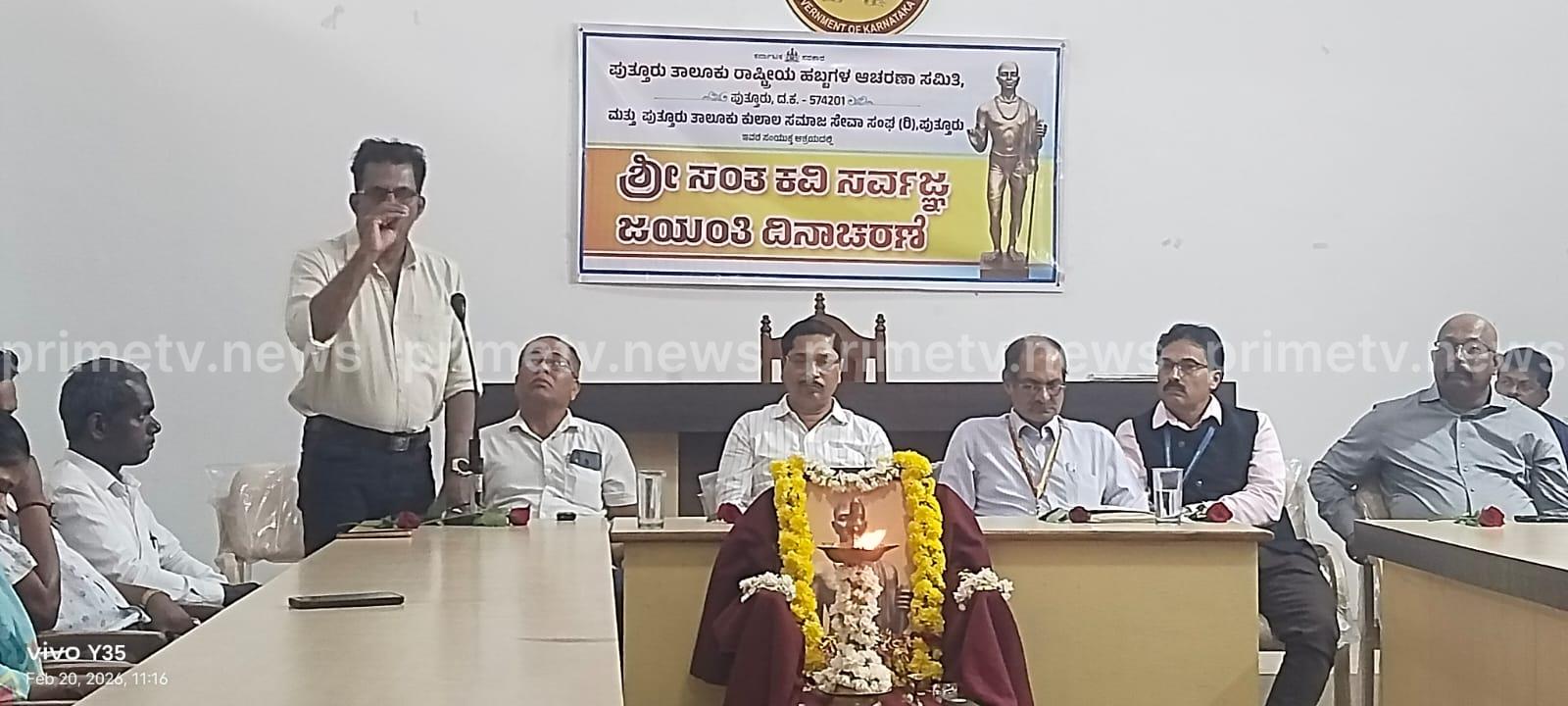 ರಾಷ್ಟ್ರೀಯ ಹಬ್ಬಗಳ ಆಚರಣಾ ಸಮಿತಿ ಹಾಗೂ ಕುಲಾಲ ಸೇವಾಸಂಘದ ಆಶ್ರಯದಲ್ಲಿ ಪುತ್ತೂರು ಆಡಳಿತ ಸೌಧದ ಸಭಾಂಗಣದಲ್ಲಿ ನಡೆದ ಸಂತ ಕವಿ ಸರ್ವಜ್ಞ ಜಯಂತಿ ದಿನಾಚರಣೆಯನ್ನು ಉದ್ಘಾಟಿಸಿ ಅವರು ಮಾತನಾಡಿದರು. ಉತ್ತಮ ಸಮಾಜ ನಿರ್ಮಾಣಕ್ಕೆ ಅಗತ್ಯವಾದ ಚಿಂತನೆಗಳನ್ನು ಸರ್ವಜ್ಞರು ತಮ್ಮ ತ್ರಿಪದಿಗಳ ಮೂಲಕ ನೀಡಿದ್ದಾರೆ. ಸಮಾನತೆ, ನೀತಿ ಮತ್ತು ಮಾನವೀಯ ಮೌಲ್ಯಗಳನ್ನು ಸಾರಿದ ಅವರ ಸಂದೇಶಗಳು ಇಂದಿಗೂ ಮಾರ್ಗದರ್ಶಕವಾಗಿವೆ ಎಂದರು.