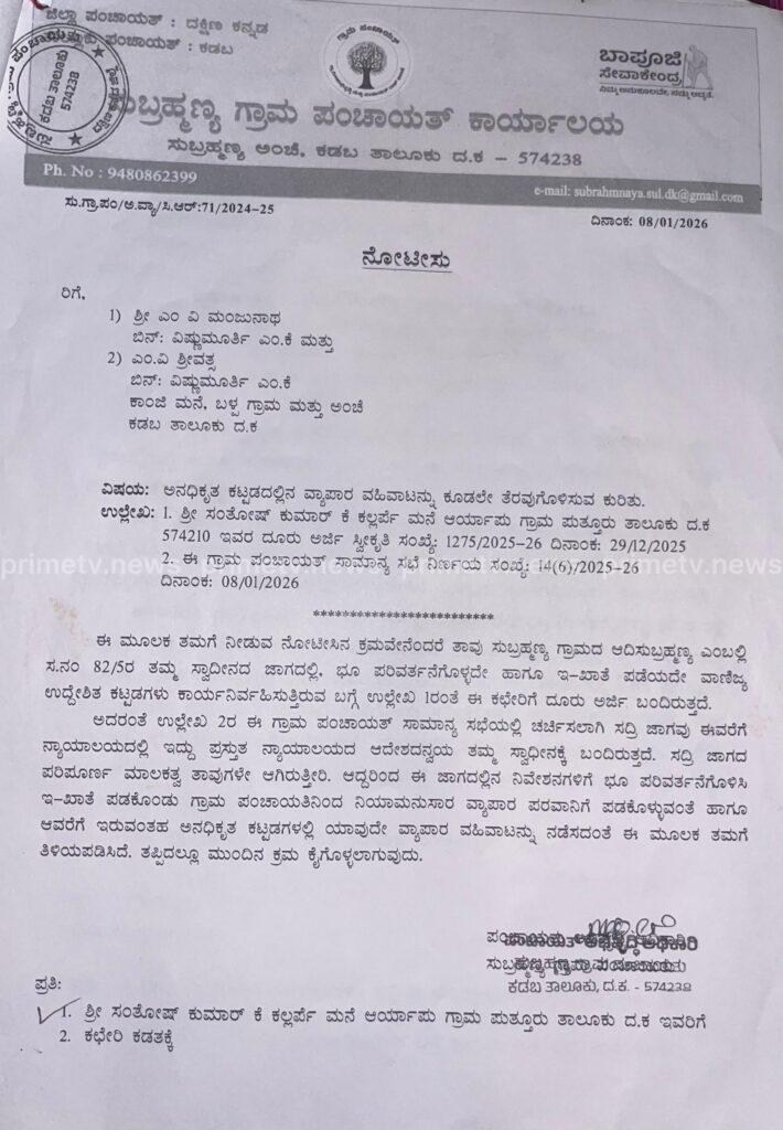 ಸುಬ್ರಹ್ಮಣ್ಯ ಗ್ರಾಮ ಪಂಚಾಯತ್ಗೆ ಬಂದ ದೂರಿನ ಆಧಾರದಲ್ಲಿ ಜನವರಿ 8ರಂದು ಭೂ ಮಾಲೀಕರಿಗೆ ಅಂಗಡಿಗಳನ್ನು ಬಂದ್ ಮಾಡಲು ನೋಟಿಸ್ ನೀಡಲಾಗಿತ್ತು. ಆದರೆ, ಆ ನೋಟಿಸ್ಗೆ ಯಾವುದೇ ಬೆಲೆ ನೀಡದೇ ಅಂಗಡಿಗಳು ಇನ್ನೂ ನಿರಂತರವಾಗಿ ಕಾರ್ಯಾಚರಿಸುತ್ತಿರುವುದು ದೊಡ್ಡ ಪ್ರಶ್ನೆಯನ್ನು ಹುಟ್ಟಿಸಿದೆ.