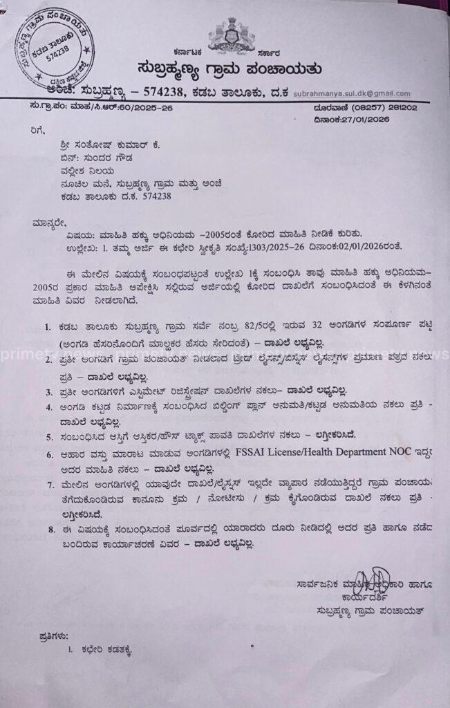 ಇದರ ನಡುವೆ ಈ ಹಿಂದೆ RTI ಮೂಲಕ ಕೇಳಿದ ಮಾಹಿತಿಗೆ ಸಂಬಂಧಿಸಿದ ದಾಖಲೆಗಳೇ ಇಲ್ಲವೆಂದು ಪಂಚಾಯತ್ ಉತ್ತರ ನೀಡಿರುವುದು ಕೇವಲ ನೋಟೀಸ್ ನೀಡಲಾಗಿದೆ ಎಂಬ ಮಾಹಿತಿ ನೀಡಿದ್ದು ಪ್ರಕರಣವನ್ನು ಇನ್ನಷ್ಟು ಗಂಭೀರಗೊಳಿಸಿದೆ. ದಾಖಲೆಗಳಿಲ್ಲದೆ ವಾಣಿಜ್ಯ ಚಟುವಟಿಕೆ ನಡೆಯುತ್ತಿರುವುದು ಕಾನೂನು ಉಲ್ಲಂಘನೆಯ ಸ್ಪಷ್ಟ ಉದಾಹರಣೆಯೆಂದು ಸ್ಥಳೀಯರು ಆರೋಪಿಸಿದ್ದಾರೆ.
