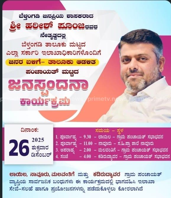 ಬೆಳ್ತಂಗಡಿ ಶಾಸಕರಾದ ಶ್ರೀ ಹರೀಶ್ ಪೂಂಜ ರವರ ನೇತೃತ್ವದಲ್ಲಿ ಬೆಳ್ತಂಗಡಿ ತಾಲೂಕು ಮಟ್ಟದ ಎಲ್ಲಾ ಸರ್ಕಾರಿ ಇಲಾಖಾಧಿಕಾರಿಗಳೊಂದಿಗೆ ದಿನಾಂಕ: 26 ಡಿಸೆಂಬರ್ 2025, ಶುಕ್ರವಾರ ದಂದು ಜನರ ಬಳಿಗೆ-ತಾಲೂಕು ಆಡಳಿತ ಪಂಚಾಯತ್ ಮಟ್ಟದ ಜನಸ್ಪಂದನಾ ಕಾರ್ಯಕ್ರಮ ನಡೆಸಲಿದ್ದಾರೆ.