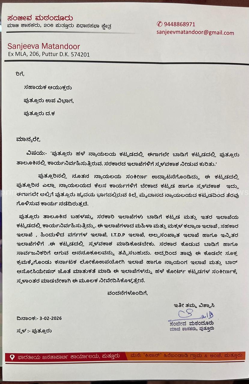 ಮನವಿಯಲ್ಲಿ, ನೂತನ ನ್ಯಾಯಾಲಯ ಸಂಕೀರ್ಣದಲ್ಲಿ ಪುತ್ತೂರು ತಾಲೂಕಿನ ಎಲ್ಲಾ ನ್ಯಾಯಾಲಯಗಳ ಕಾರ್ಯಚಟುವಟಿಕೆಗಳಿಗೆ ಅಗತ್ಯವಿರುವ ಸಮರ್ಪಕ ಕಟ್ಟಡ ಹಾಗೂ ಮೂಲಸೌಕರ್ಯಗಳು ಲಭ್ಯವಿರುವುದರಿಂದ, ಪುತ್ತೂರು ಹೃದಯ ಭಾಗದಲ್ಲಿರುವ ಕಿಲ್ಲೆ ಮೈದಾನದ ಹಳೆ ನ್ಯಾಯಾಲಯ ಕಟ್ಟಡವನ್ನು ಈಗಾಗಲೇ ತೆರವುಗೊಳಿಸಲಾಗುತ್ತಿದೆ ಎಂದು ಉಲ್ಲೇಖಿಸಲಾಗಿದೆ.