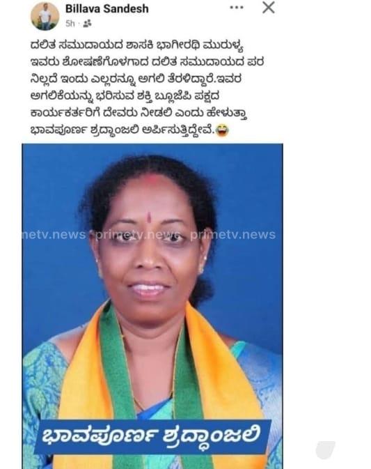 ಬಿಲ್ಲವ ಸಂದೇಶ್ ಎಂಬ ವ್ಯಕ್ತಿಯೊಬ್ಬ ಫೇಸ್ಬುಕ್ ನಲ್ಲಿ ಸುಳ್ಯ ಶಾಸಕರಾದ ಭಾಗೀರಥಿ ಮುರುಳ್ಯ ರ ಭಾವಚಿತ್ರ ಹಾಕಿ ಶ್ರದ್ಧಾಂಜಲಿ ಎಂದಿರುವುದನ್ನು ಮಾಡಿರುವುದನ್ನು ಕರ್ನಾಟಕ ರಾಜ್ಯ ಆದಿ ದ್ರಾವಿಡ ಸಂಘದ ಉಪಾಧ್ಯಕ್ಷರಾದ ಶ್ರೀನಿವಾಸ್ ಕಾರ್ಲ ಖಂಡಿಸಿದ್ದಾರೆ.