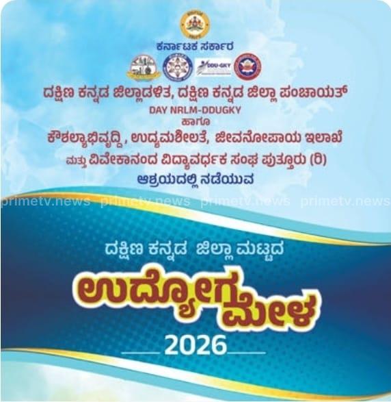 ಪುತ್ತೂರು: ದಕ್ಷಿಣ ಕನ್ನಡ ಜಿಲ್ಲಾಡಳಿತ, ದಕ್ಷಿಣ ಕನ್ನಡ ಜಿಲ್ಲಾ , DAY NRLM-DDUGKY ಕೌಶಲ್ಯಾಭಿವೃದ್ಧಿ, ಉದ್ಯಮಶೀಲತೆ, ಜೀವನೋಪಾಯ ಇಲಾಖೆ ಮತ್ತು ವಿವೇಕಾನಂದ ವಿದ್ಯಾವರ್ಧಕ ಸಂಘ ಪುತ್ತೂರು(ರಿ) ಇದರ ಆಶ್ರಯದಲ್ಲಿ ಜಿಲ್ಲಾಮಟ್ಟದ ಉದ್ಯೋಗ ಮೇಳ 2026 ಪುತ್ತೂರಿನ ವಿವೇಕಾನಂದ ಕಾಲೇಜ್ ಆಫ್ ಇಂಜಿನಿಯರಿಂಗ್ ಎಂಡ್ ಟೆಕ್ನಾಲಜಿಯ ಆವರಣದಲ್ಲಿ ಫೆಬ್ರವರಿ 21 ಶನಿವಾರದಂದು ಬೆಳಿಗ್ಗೆ 9 ಗಂಟೆಯಿಂದ ಸಂಜೆ 4 ಗಂಟೆಯವರೆಗೆ ನಡೆಯಲಿದೆ.