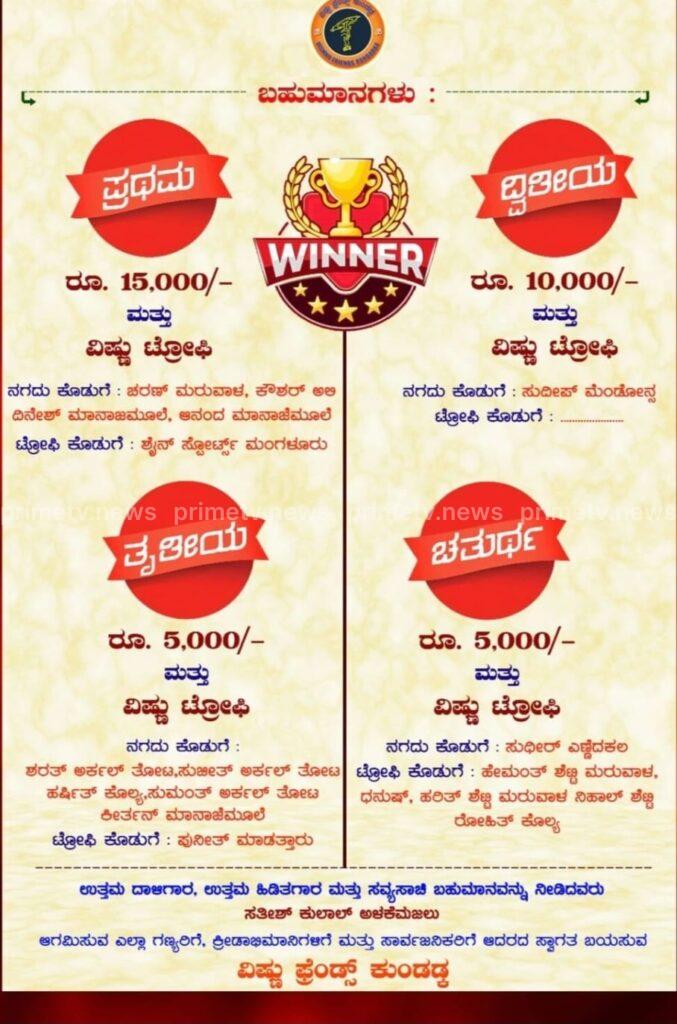 ಈ ಪಂದ್ಯಾಟದ ಮೊದಲ ಬಹುಮಾನವಾಗಿ 15000 ನಗದು ಮತ್ತು ವಿಷ್ಣು ಟ್ರೋಫಿ, ದ್ವಿತೀಯ ಬಹುಮಾನವಾಗಿ 10000 ಮತ್ತು ವಿಷ್ಣು ಟ್ರೋಫಿ, ತೃತೀಯ ಬಹುಮಾನವಾಗಿ 5000 ಮತ್ತು ವಿಷ್ಣು ಟ್ರೋಫಿ, ಚತುರ್ಥ ಬಹುಮಾನವಾಗಿ 5000 ಮತ್ತು ಉತ್ತಮ ದಾಳಿಗಾರ, ಉತ್ತಮ ಹಿಡಿತಗಾರ ಮತ್ತು ಸವ್ಯಾಸಾಚಿ ಬಹುಮಾನ ಇರಲಿದೆ ಎಂದು ಆಯೋಜಕರು ತಿಳಿಸಿದ್ದಾರೆ.