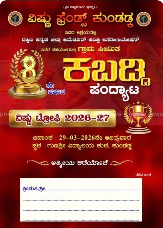 ವಿಷ್ಣು ಫ್ರೆಂಡ್ಸ್ ಕುಂಡಡ್ಕ ಇದರ ಆಶ್ರಯದಲ್ಲಿ ದಕ್ಷಿಣ ಕನ್ನಡ ಜಿಲ್ಲಾ ಅಮೆಚೂರ್ ಕಬ್ಬಡಿ ಅಸೋಸಿಯೇಷನ್ ಇದರ ಸಹಯೋಗದಲ್ಲಿ ಗ್ರಾಮ ಸೀಮಿತ 8ನೇ ವರುಷದ ವಿಷ್ಣು ಟ್ರೋಫಿ 2026- 27 ದಿನಾಂಕ ಮಾರ್ಚ್ 29 ರ ಆದಿತ್ಯವಾರ ಗುಣಶ್ರೀ ವಿದ್ಯಾಲಯ ಕುಳ ಕುಂಡಡ್ಕದಲ್ಲಿ ನಡೆಯಲಿದೆ.